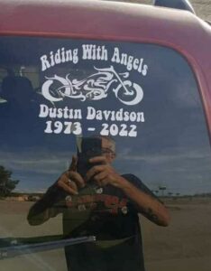 The vehicle’s current condition is muddy, and it has a distinctive sticker in the rear window that reads “Riding with Angels – Dustin Davidson.” If you’ve spotted this vehicle in the Mohave County area, please contact the Mohave County Sheriff’s Department at (928) 768-7055.