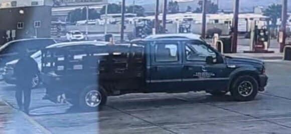 We are seeking the public’s assistance in locating this vehicle and identifying two men involved in a burglary. The vehicle was stolen in Mesquite, then used to back into the wall of a gas station in the 4000 block of Fleet St. in Littlefield and steal an ATM machine. Two men (one shown below) loaded the ATM into the back of the truck and fled the scene.